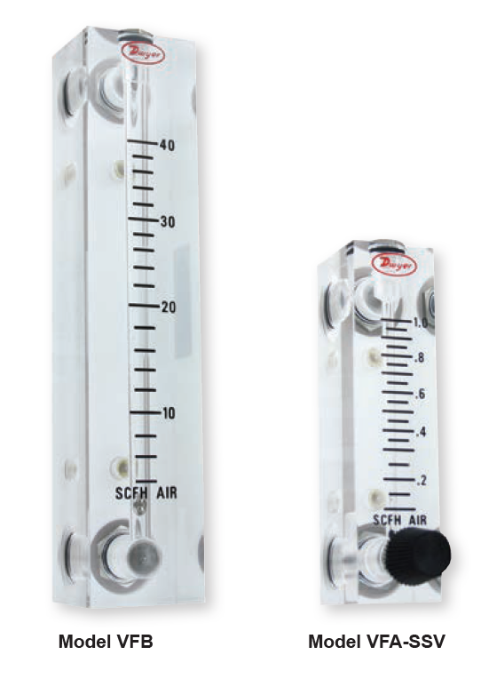 SCALES ARE EASY TO READ — The front scale location and white background provides excellent visibility. The direct reading scales are hot stamped into the plastic and will not wear off. Mid–range calibration is established with a master flowmeter. Accuracy is ±5% of full scale for VFA models, ±3% for VFB.Scales average 2˝ long on the VFA models, 4˝ long on VFB.