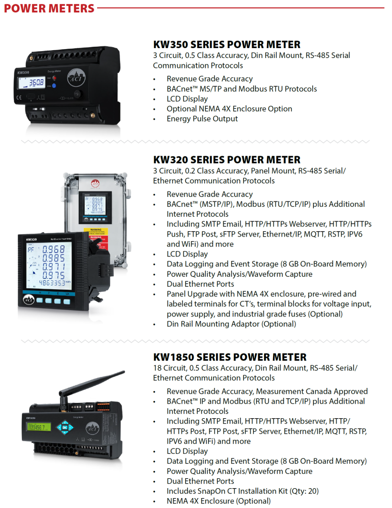 ACI Meters can target key areas to lower your energy costs. They provide additional value by reducing maintenance costs through predictive maintenance, identifying outdated and underperforming equipment, and calculating project Return of Investment (ROI). Power monitoring solutions are also available for use without a traditional BAS type monitoring system through the on-board data logging capabilities, enabling the data to be downloaded into an excel (.csv) spread sheet.