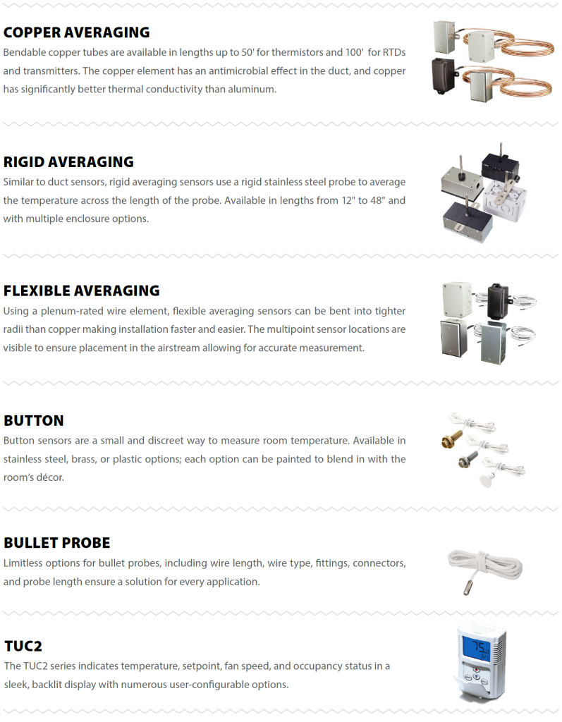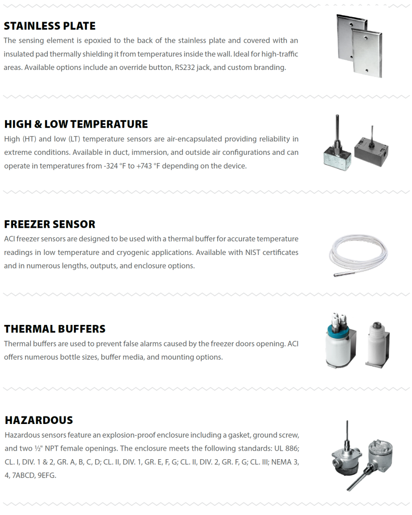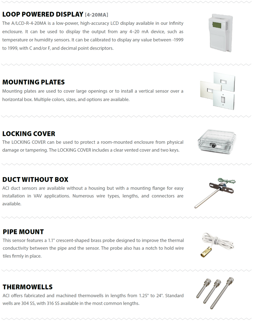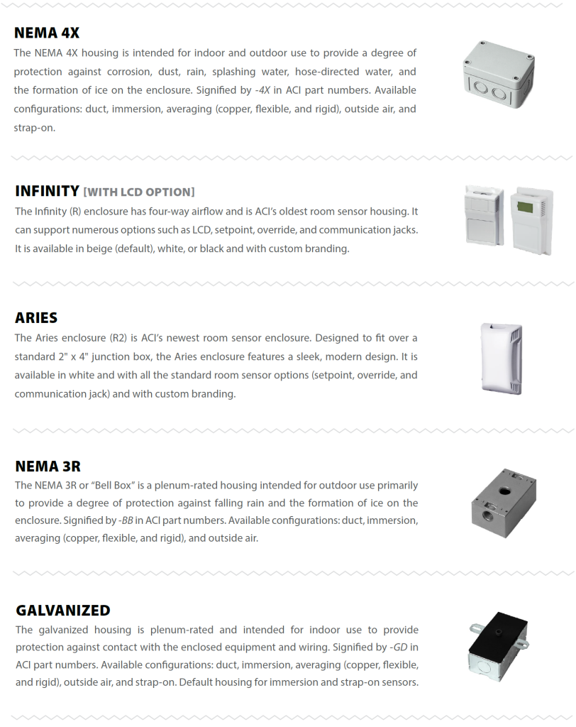 Accurate temperature measurement is the foundation of any building control system. ACI manufactures temperature sensors, including thermistors, RTDs, and transmitters to fit every application and meet the most demanding specifications. Most sensors are double-encapsulated to ensure durability. ACI has the manufacturing flexibility to provide unique solutions for all volume